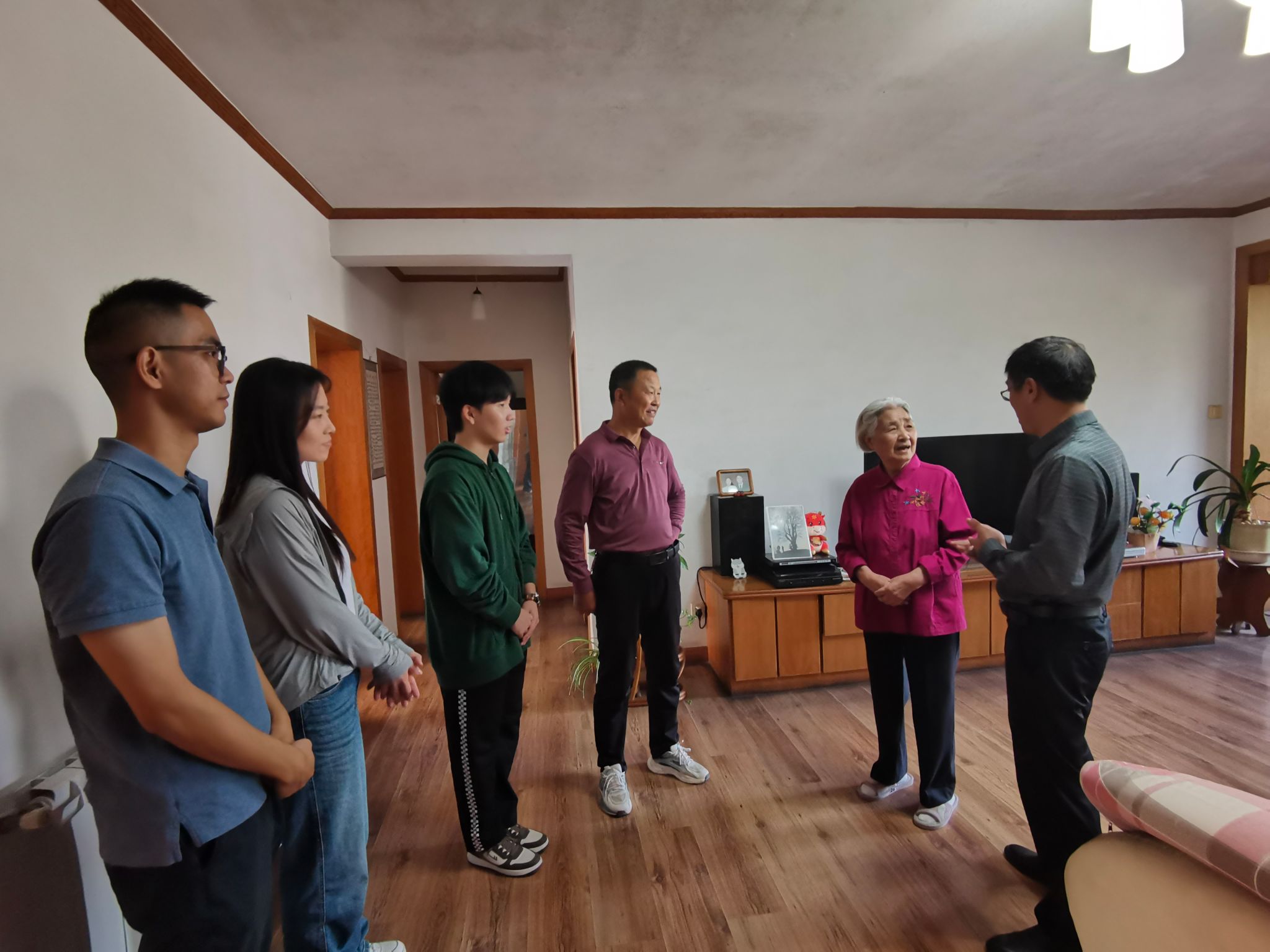 廖志凌一行先后来到学院农机实验大厅、老教师家中、德高护理院等地亲自为老教师送去节日祝福。在耒耜大楼前,廖志凌与刚退休仍热心学院工作、大清早亲自来帮忙开机器的孙宏伟老师亲切交谈,对他的无私奉献表达了由衷的感谢。随后走访慰问了李协征、王光亮、陈翠英等近90岁高龄的老教师,向老教师介绍了学校学院的最新发展规划,详细询问了老教师们的生活及健康情况,并感谢老教师们对学院工作的支持,表示学院将全力以赴为老教师提供便利和服务。