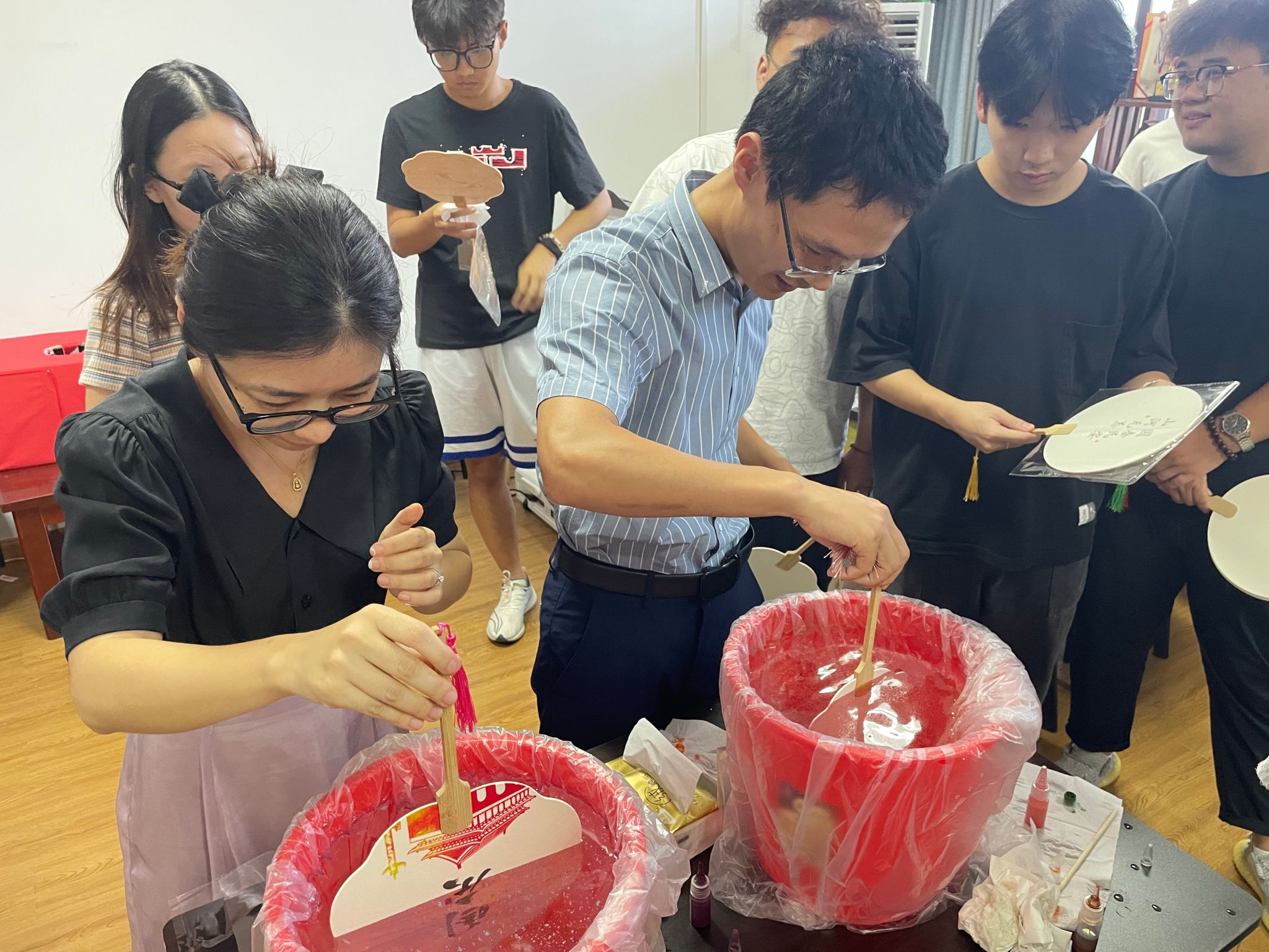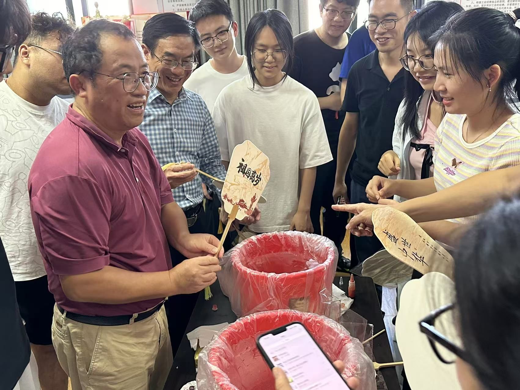 “将大漆颜料滴入水中,轻轻搅开,扇子要垂直浸入,入水时左右摇晃或轻微旋转……”在学生讲解员的指导下,学院师生不仅亲手体验了从选材、制胎到上漆、描绘的每一个制作环节,更在此基础上进行了大胆的创新与尝试。他们用自己的理解和创意,为传统漆扇注入了新的活力。