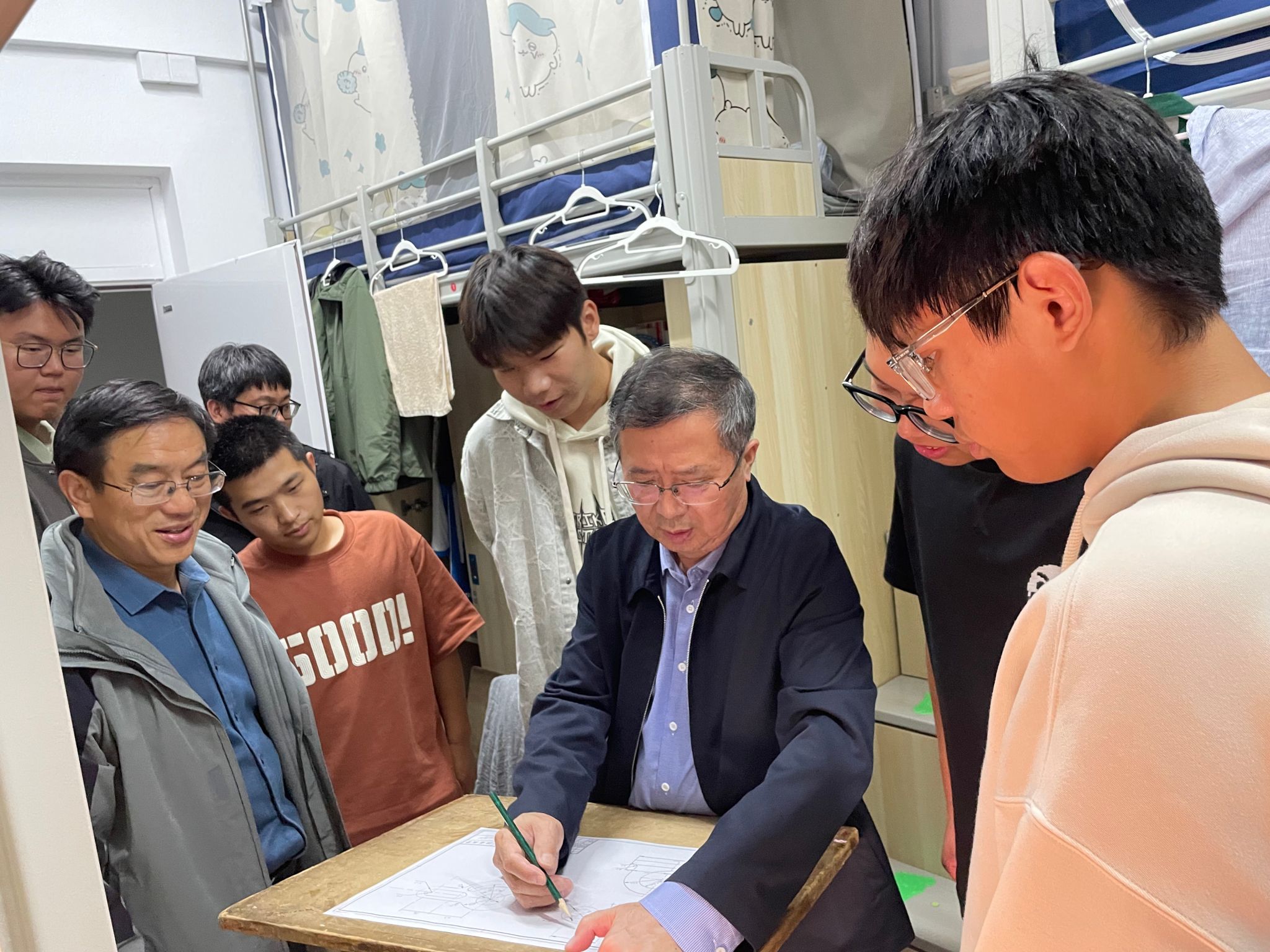 在农机专业2024级新生宿舍,李耀明老师与同学们亲切交流,为大学生们规划人生,并现场手把手指导学生手绘机械制图,李老师语重心长地要求同学们平时务必养成良好的生活与学习习惯,善于学习思考、勤于动手实践,为以后更高水平科研创新夯实专业基础。