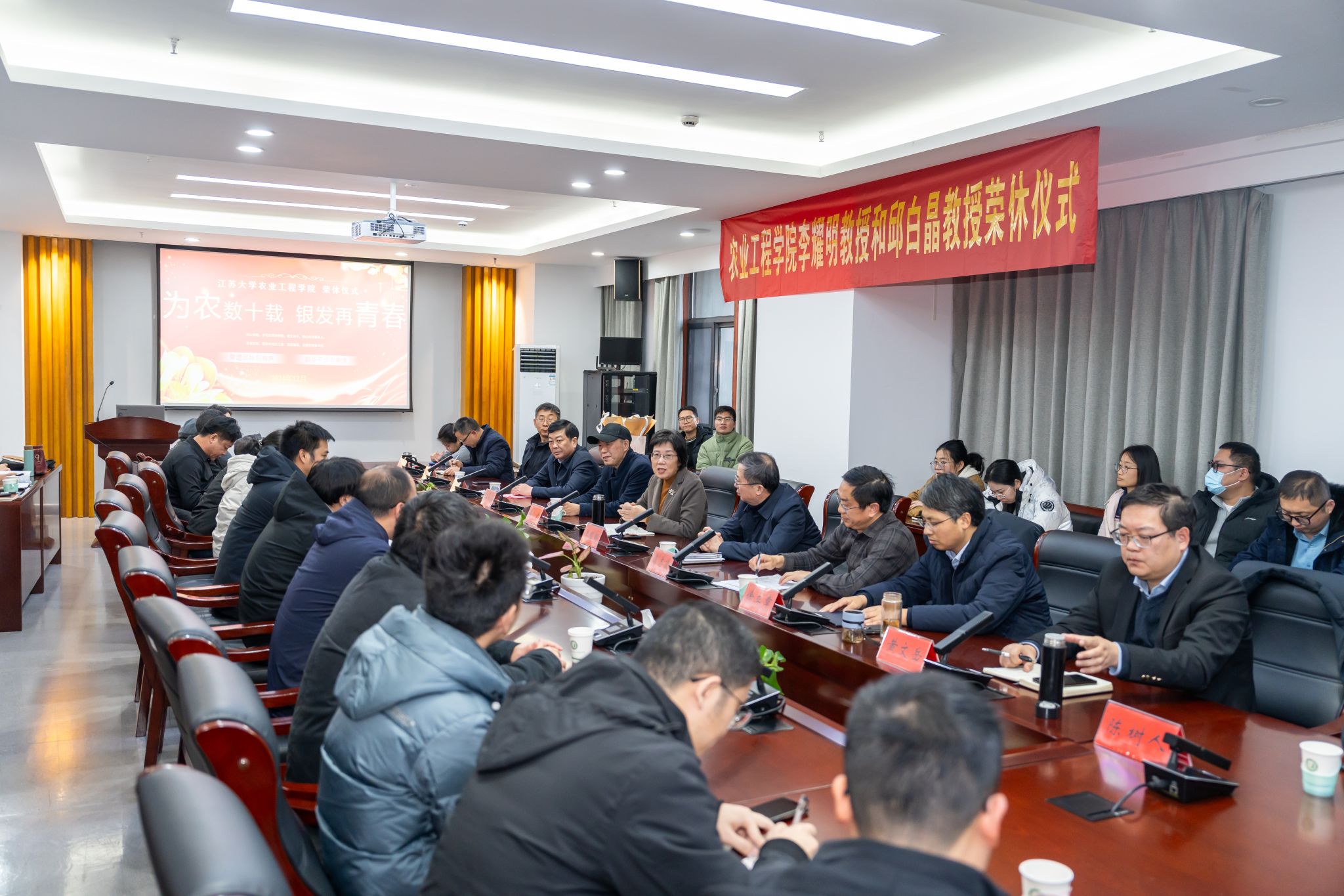 12月16日,77779193永利官网集团在耒耜大楼F304会议室举行关工委老教师李耀明和邱白晶的荣休仪式。校党委常委、副校长李红,院党委书记、关工委主任廖志凌,院长贾卫东,重点实验室主任徐立章,副院长王新忠,副院长黄文岳,副书记、副院长、关工委副主任周军,关工委副主任陈树人,关工委青年委员、工会主席徐香茹等师生代表60余人参加仪式。仪式由廖志凌主持。