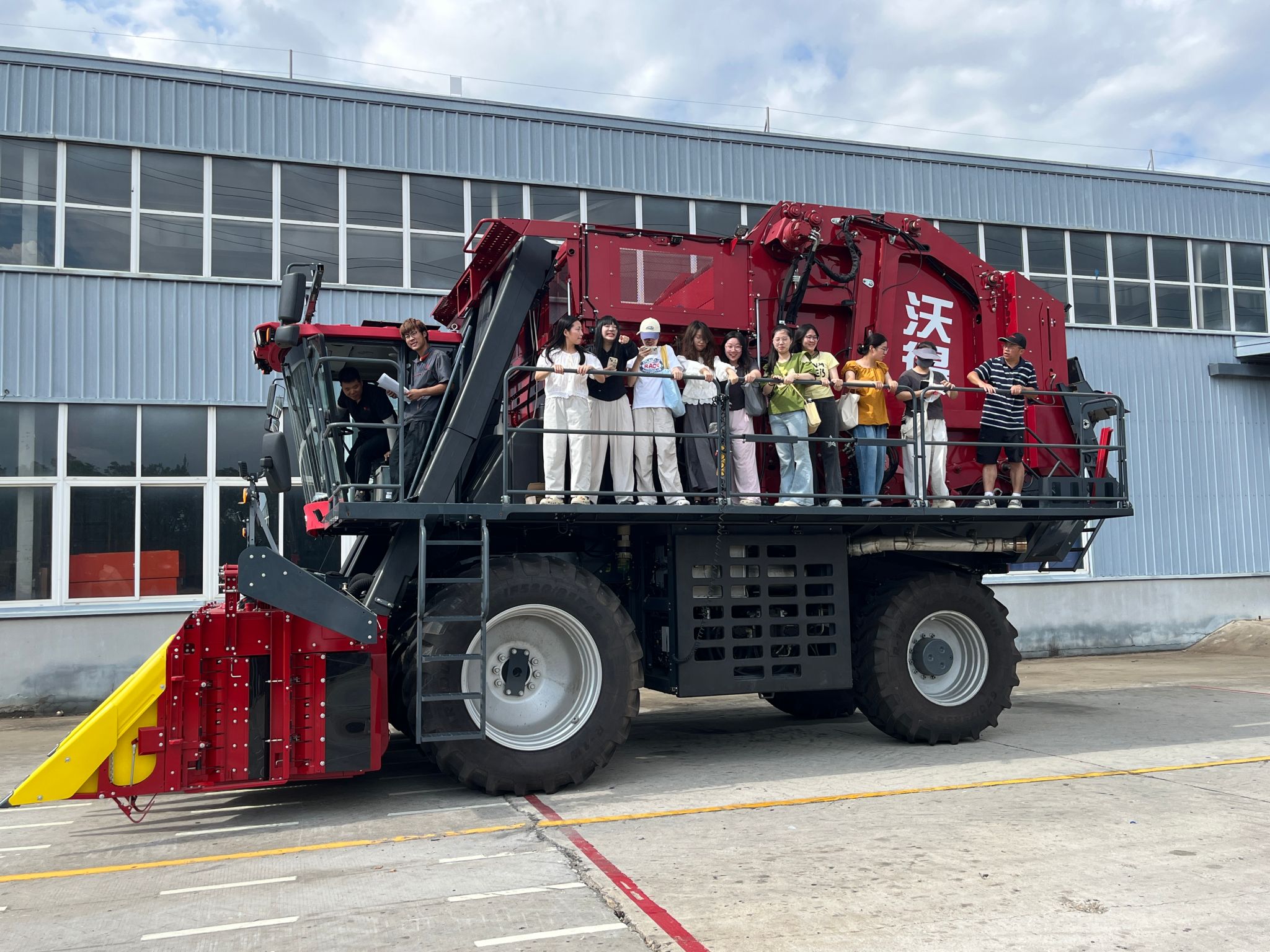 随后,大家乘车前往生产车间参观。在机械生产间,陈树人带领学生们近距离观察了从零部件组装到整机调试的各个环节。机械生产区的规范化流程,让同学们对农机制造的严谨性有了更深认识。