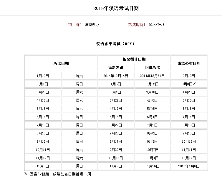 2015年3月28日开考的HSK考试报名即日起开始,请登录http://www.chinesetest.cn/getkdinfo.do?id=4048064进行网上报名。 一、报名交费截止时间:HSK:2015年3月18日 2. 缴费:报名注册成功后,网上缴费(pay online)。 3. 打印准考证:考生报名成功后,可以收到报名确认信息,并可以于报名截止日后到报名网站打印准考证,或者到报名的考点领取准考证。 4、成绩公布:当月考试日期后30个工作日左右,考生可登录http://www.chinesetest.cn/index.do查询个人成绩。 中国江苏省镇江市学府路301号 永利集团图书馆二楼电子阅览室 通讯地址:江苏省镇江市京口区学府路301号 永利集团海外教育学院 |