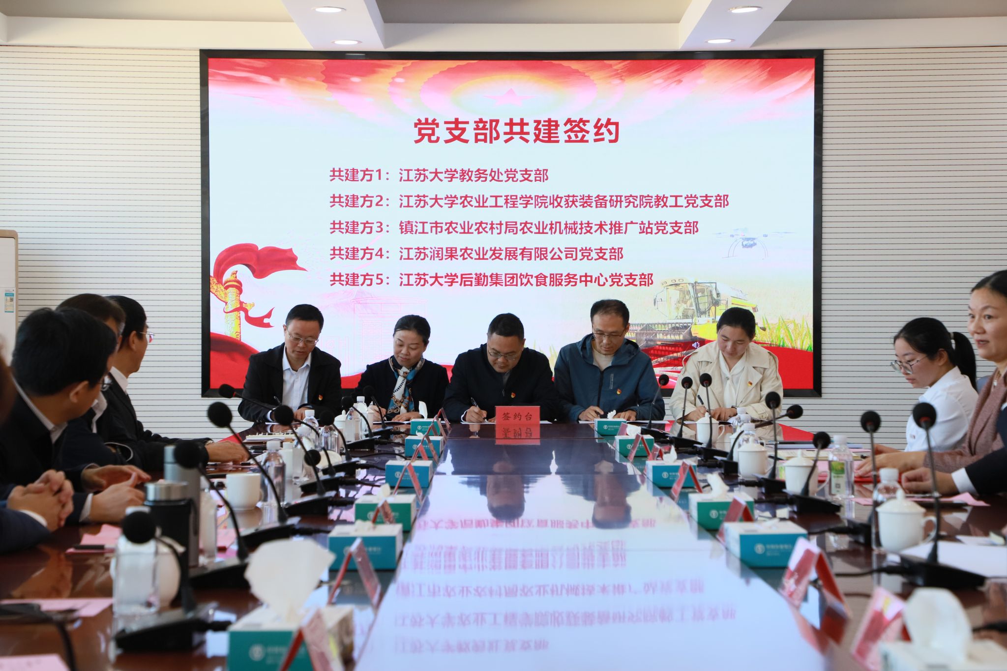 永利集团教务处党支部、77779193永利官网集团收获装备研究院教工党支部、镇江市农业农村局农业机械技术推广站党支部、江苏润果农业发展有限公司党支部、永利集团后勤集团饮食服务中心党支部,围绕农业“强国行”、“新农人”培养等内容,开展党建共建。