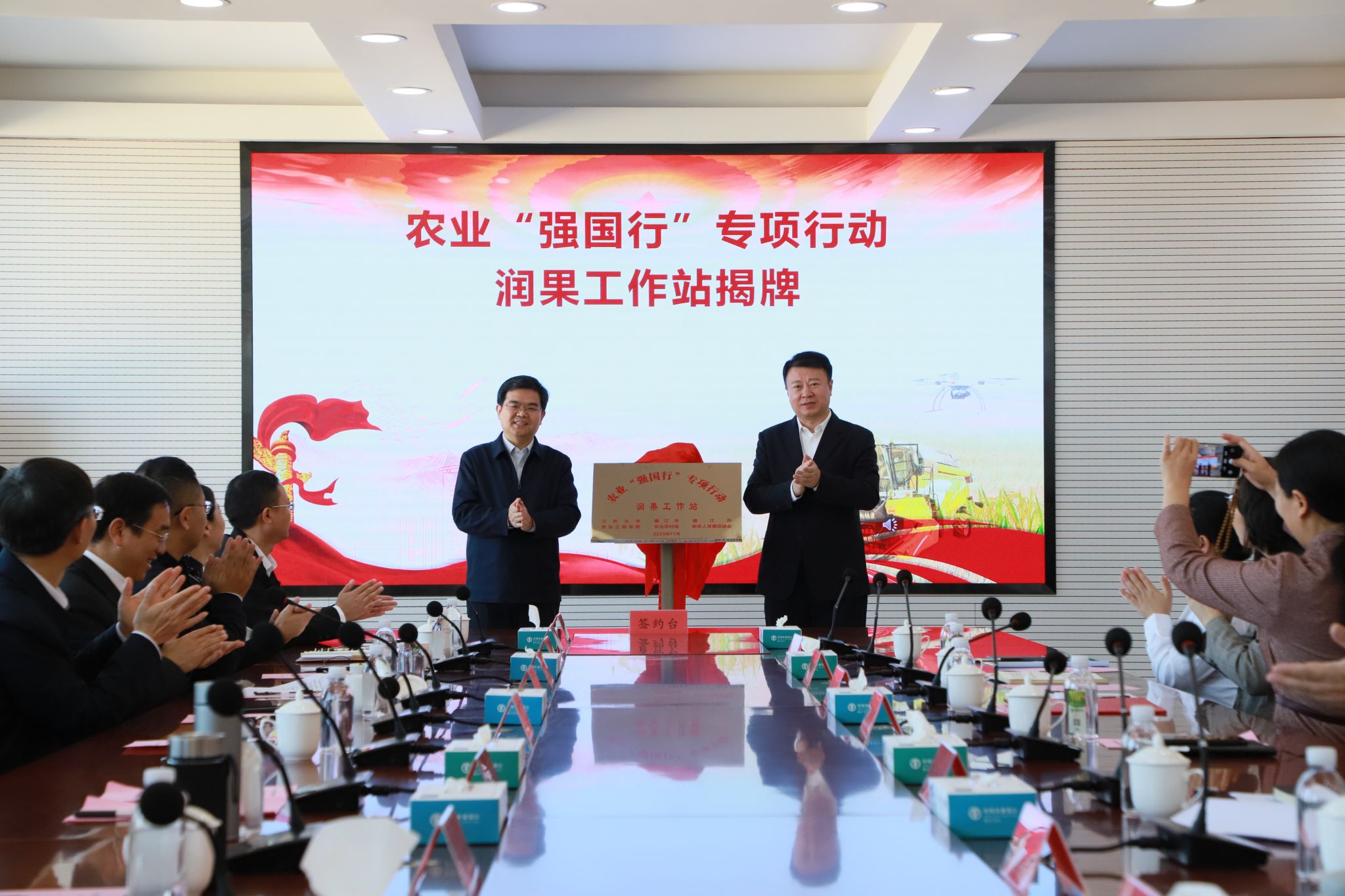 永利集团党委书记李洪波与镇江经济技术开发区党工委书记、管委会主任李朝阳为农业“强国行”专项行动润果工作站揭牌。